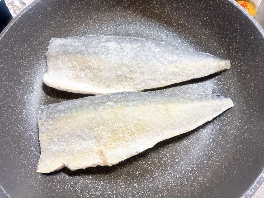 - フライパンに塩サバを入れる