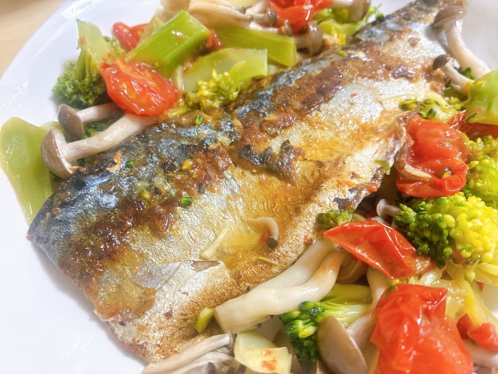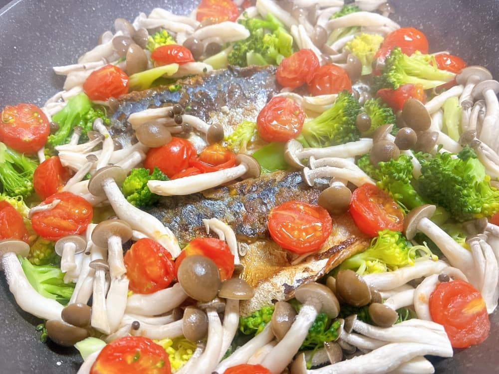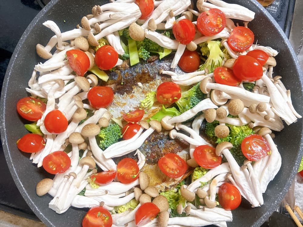 まずサバを両面こんがり焼いてから、まわりに野菜を加えました。